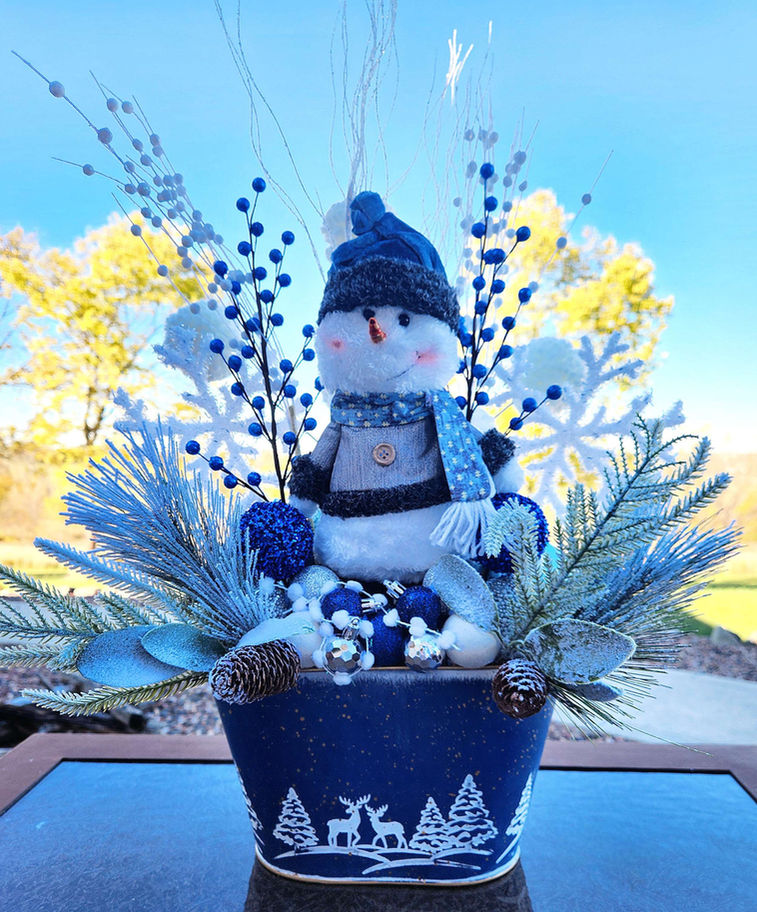 Approximately 22" high. Beautiful blue tin with a cute snowman in blue.